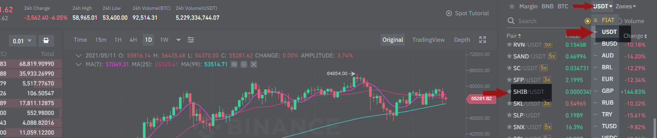 A questo punto è necessario dal menu a destra selezionare la giusta coppia SHIB/USDT facendoci click sopra.