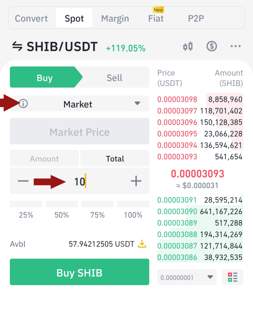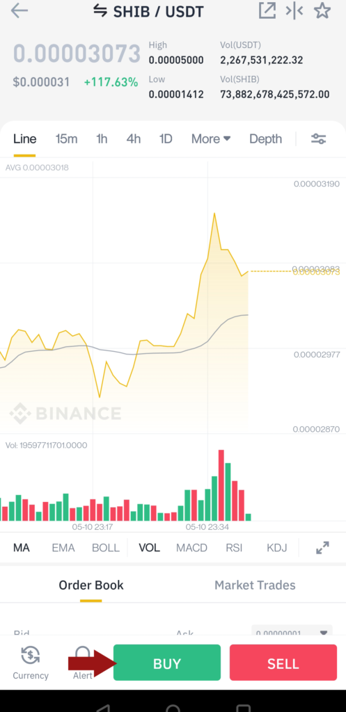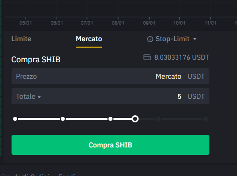 2: seleziona la coppia “SHIB/USDT” dalla sezione “Market”